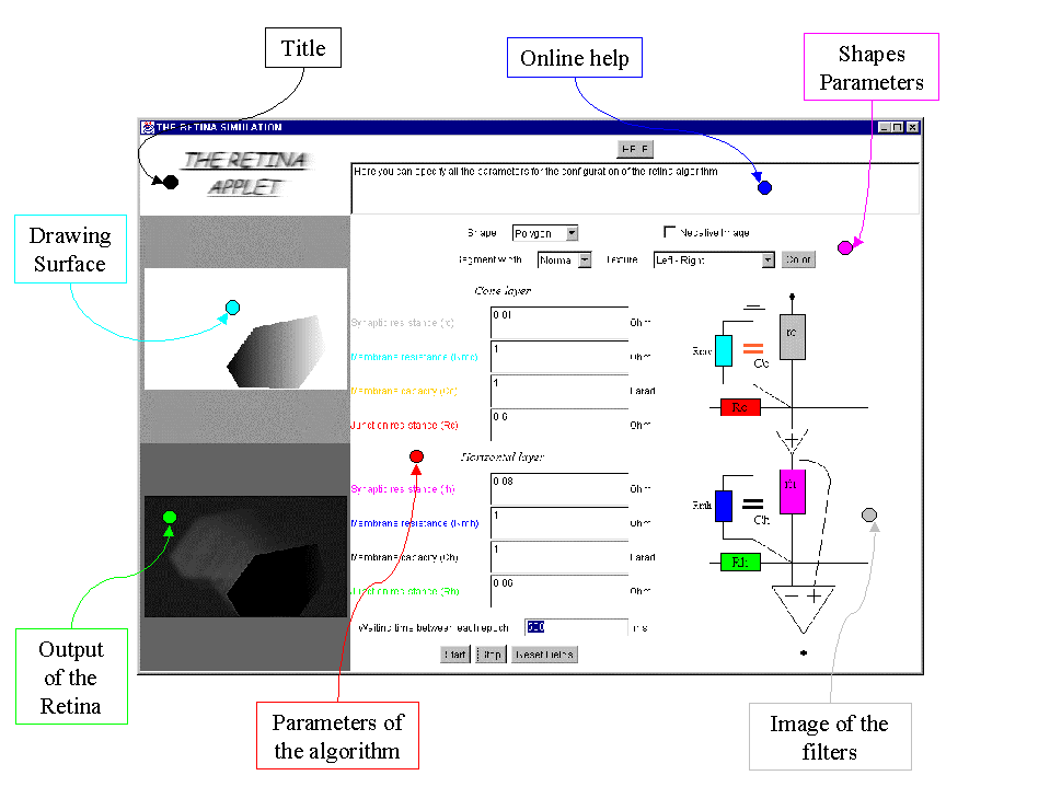 At the bottom of the applet you can see three buttons: "Start", "Stop" and "Reset Fields". The "Start" button starts the algorithm with the specified parameters. When you have clicked on it, you can move the shapes you've just created in the drawing surface area. You can only do that, all the fields in the applet are disabled, except the "Stop" button. When you click on this last button, then the simulation stops and you can draw shapes and enter others parameter. If you hit on the "Reset Fields" button then the fields of the algorithm are set with such values that you can see a good result on the output of the retina.